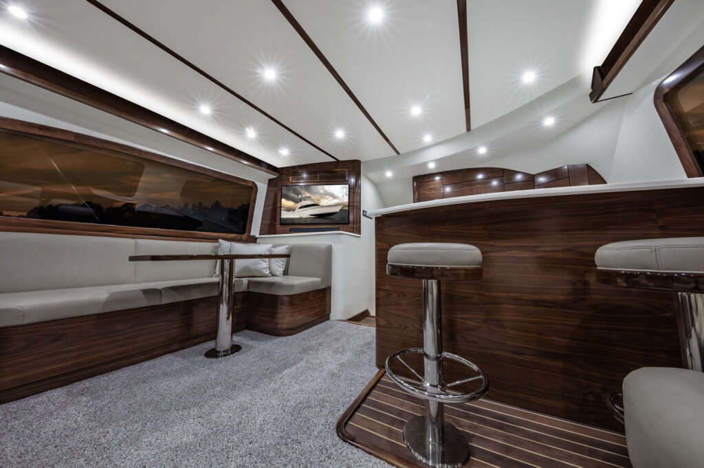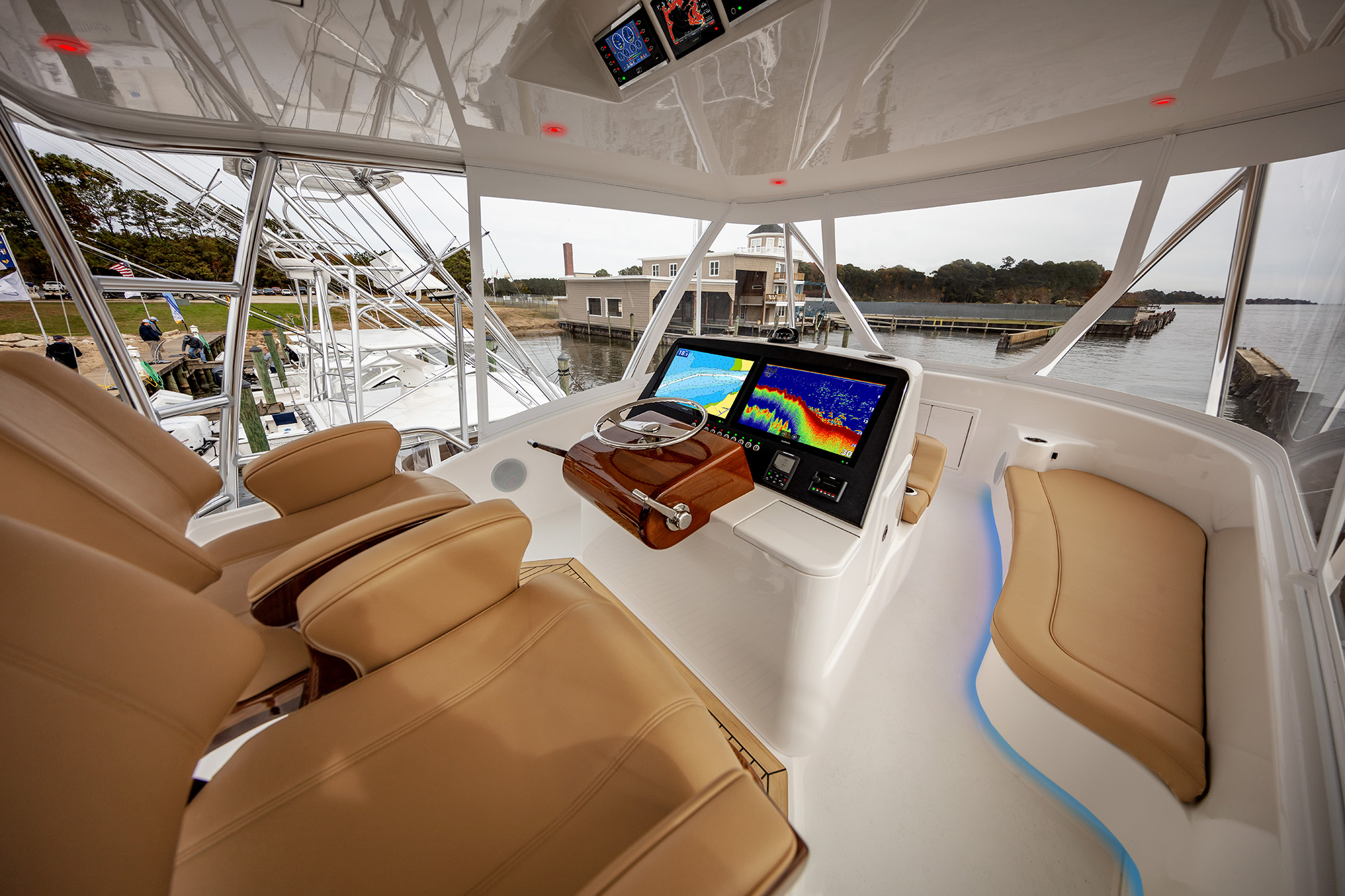 Other decisions revolved around a clean, uncluttered cockpit. “We had to put in some crown and fall and make sure it drained quickly,” said Privott. “And we wanted toe kicks, so you can go right up to the wall without stubbing your toes. And just little things. How wide does the mezzanine seat need to be to be comfortable and still be out of the way? How much cockpit do you need? Visibility from the bridge—can you see the transom as well as you can see the bow? If you’re fighting a fish or if you’re clearing rods—we had all those conversations.”