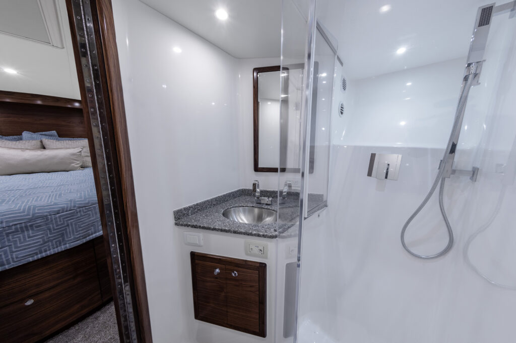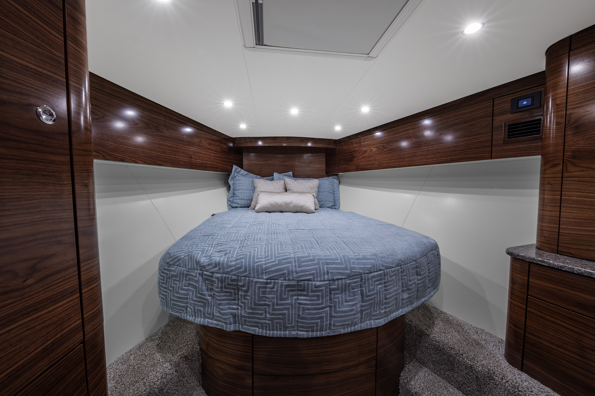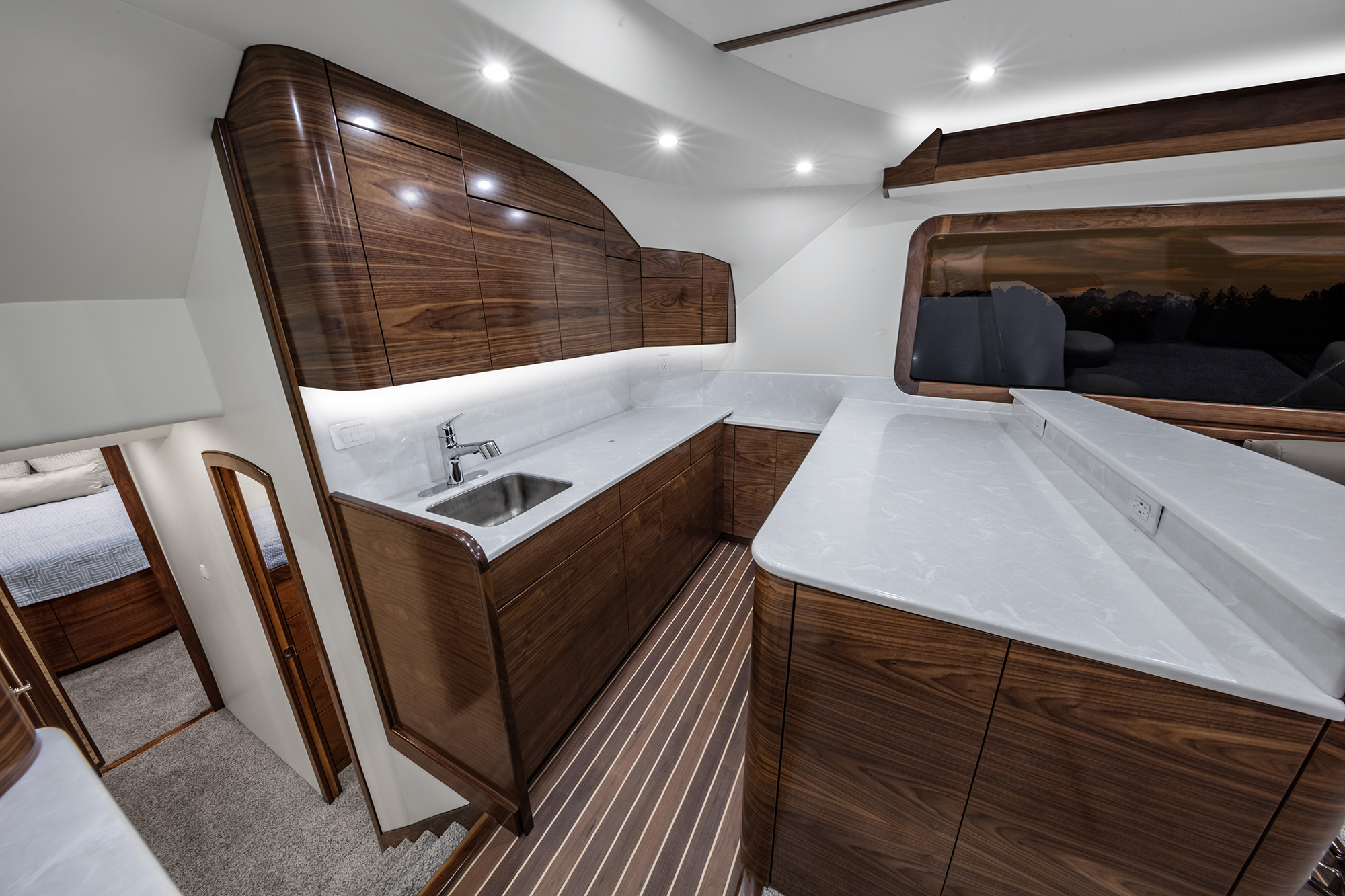 The bright interior is trimmed in walnut—one of several available options. A huge L-shaped settee can be joined with a cushion to create a huge ottoman sleeping space to starboard. Its seats open completely, creating massive gear storage areas. A twin-stooled bar separates the salon from a galley slathered with beautiful granite countertops, a nifty, counter space saving hidden cooktop and beautiful double-latching cabinets with pull out shelves. The practicality is most impressive.