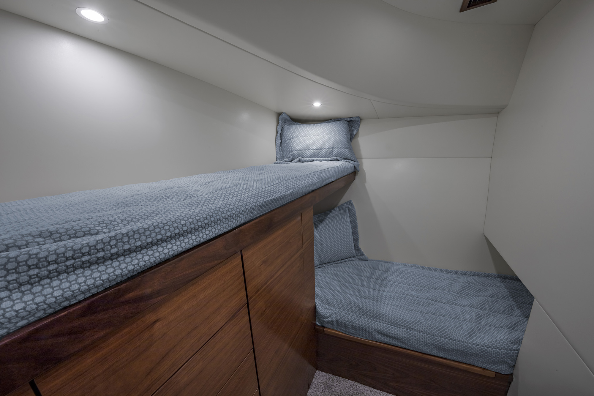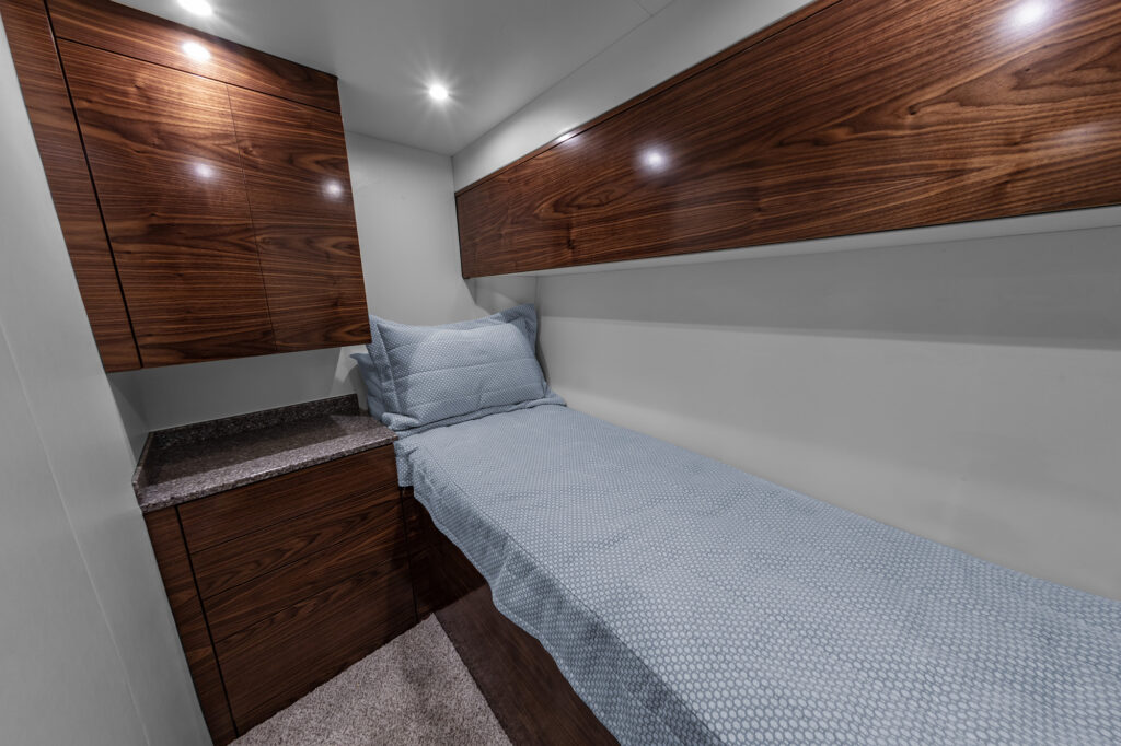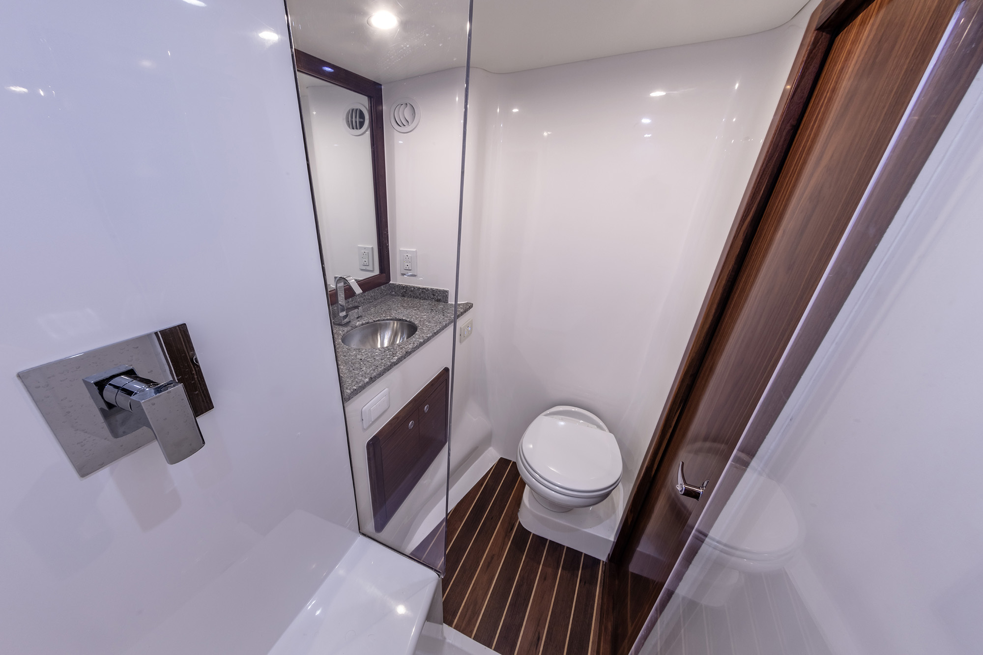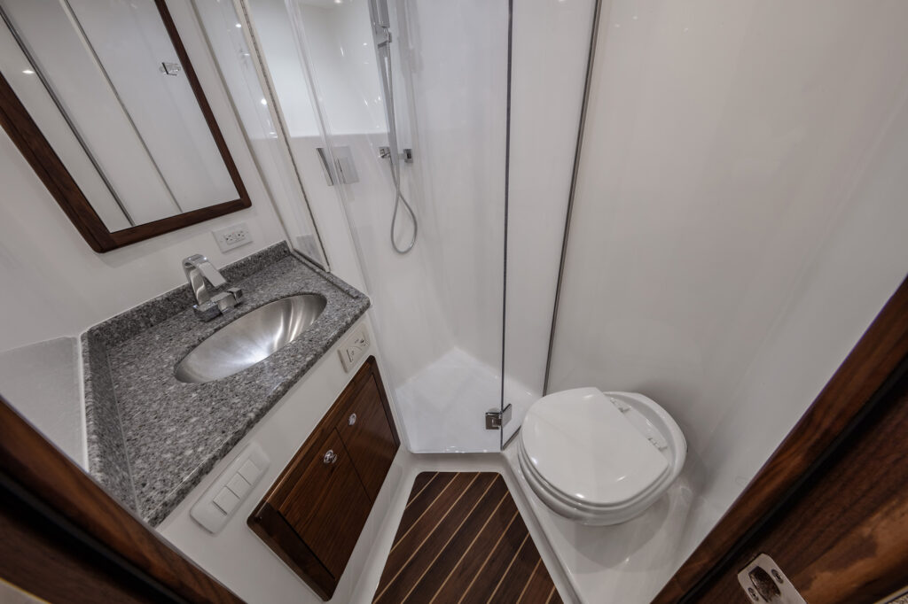 The bright interior is trimmed in walnut—one of several available options. A huge L-shaped settee can be joined with a cushion to create a huge ottoman sleeping space to starboard. Its seats open completely, creating massive gear storage areas. A twin-stooled bar separates the salon from a galley slathered with beautiful granite countertops, a nifty, counter space saving hidden cooktop and beautiful double-latching cabinets with pull out shelves. The practicality is most impressive.