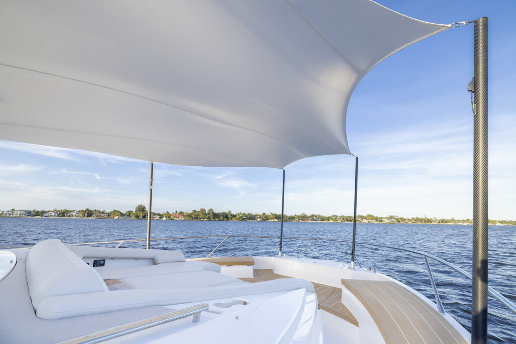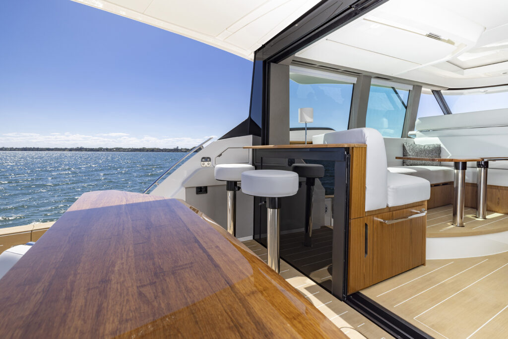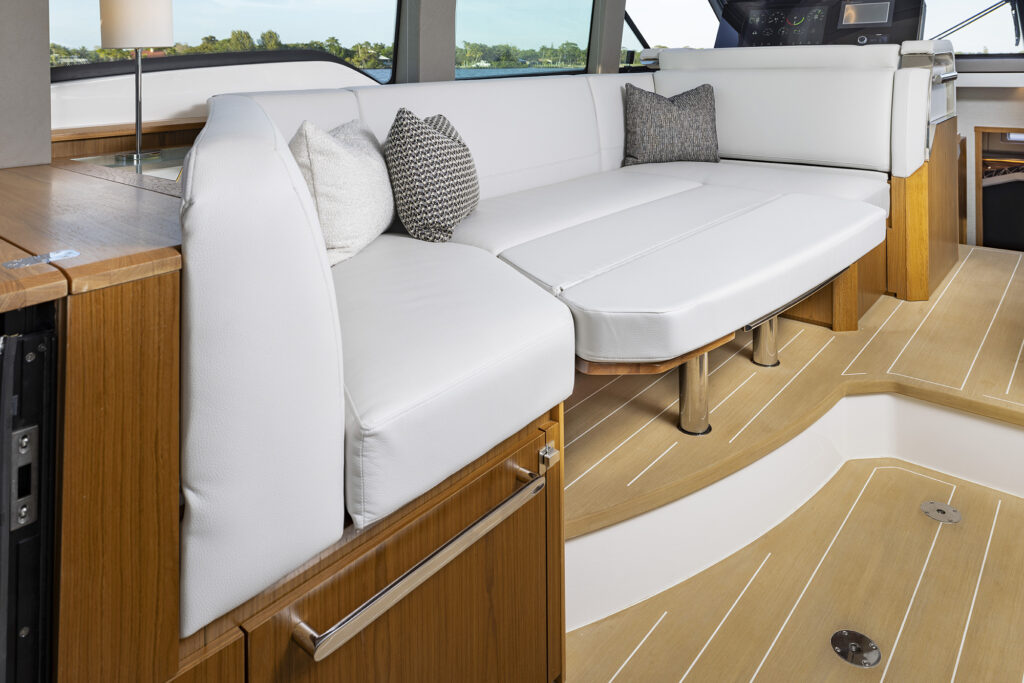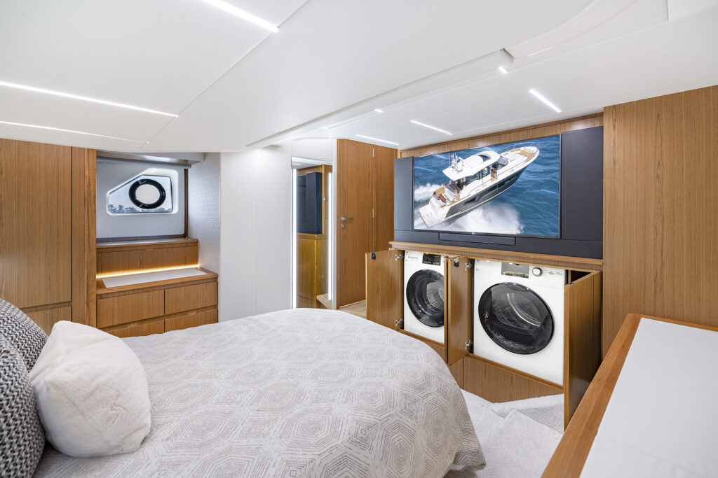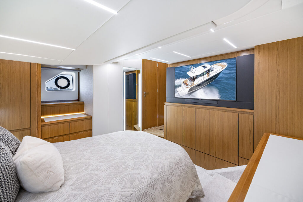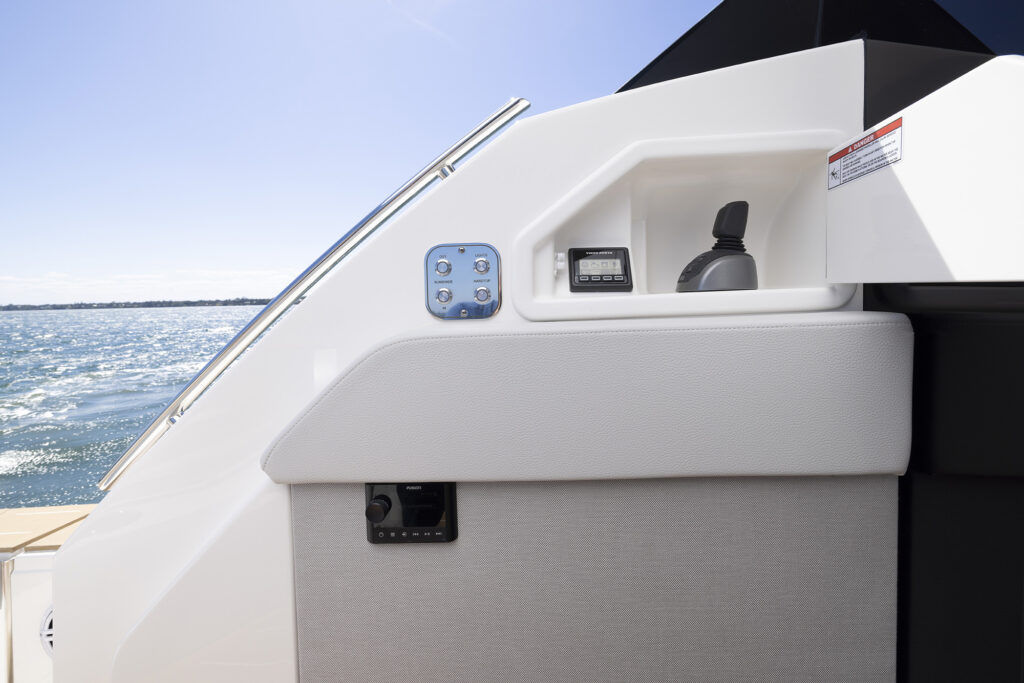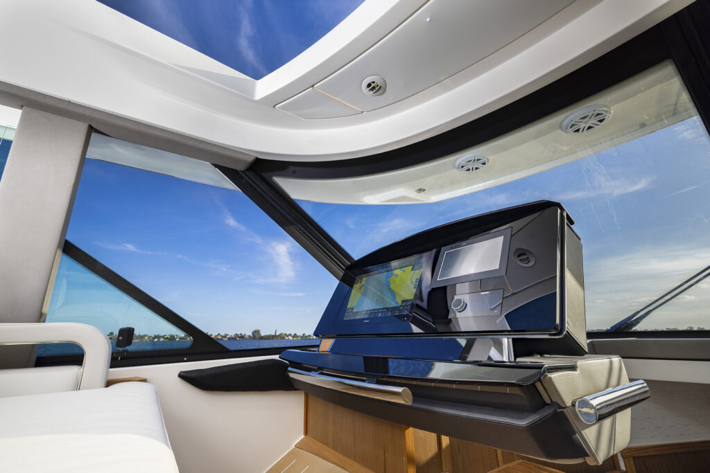 I showed off the helm to starboard with the mirrored seating to port that comes with its own MFD and Fusion stereo controls that allows the co-pilot to actually be part of the navigating journey. When it comes to navigating, my favorite party trick on the 54 is the joystick built into the starboard sliding arm rest. The ability to adjust the joystick position along with the massive side door allows the captain to stand on the side deck while docking. It essentially transforms a traditional helm into a wing station and simultaneously transforms the average boater into a docking hero.