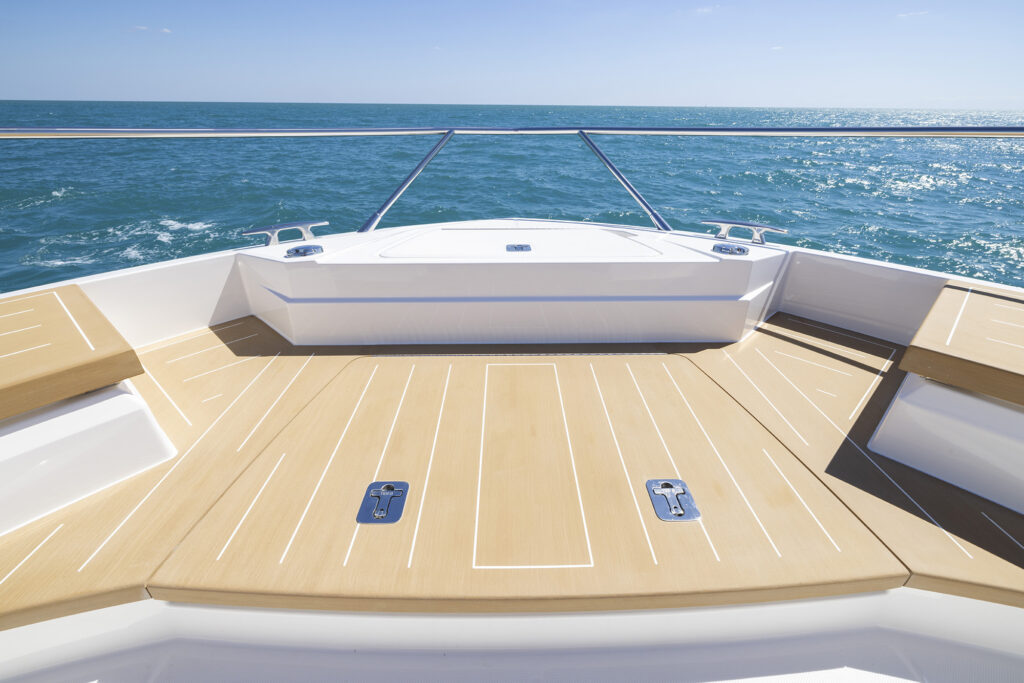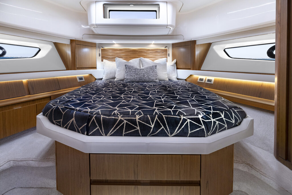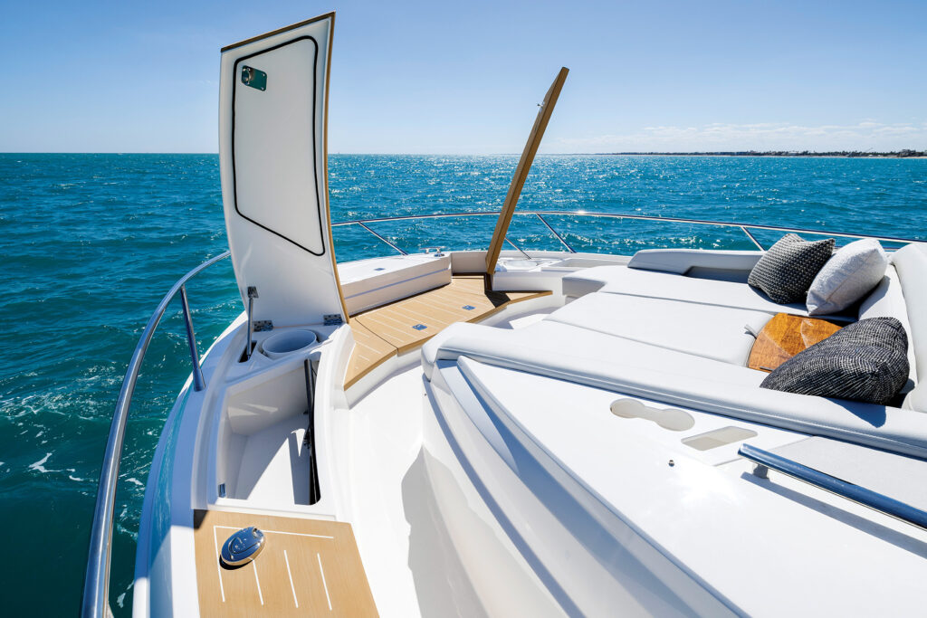 From the massive swim platform to the line storage in the bow anchor locker, the boat feels damn near identical. In fact, it’s much easier to talk about what’s different between the two models than to compare what’s the same (the fold-down gunwales, the cockpit modules, the salon and cockpit layout, the helm and side door, the general arrangement plan, bow lounge etc.). What’s different is that the guest cabin on the 54 has bunk beds instead of side-by-side twins and the power has been taken a step down from 1350s and 1050s on the 60 to IPS 950s in the 54. The top end with the smaller (a relative term) engines is still an impressive 34 knots.