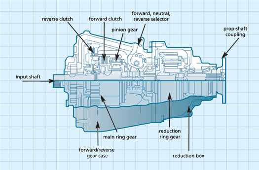 What marine transmissions do is significant but fairly simple. First, they take one-way rotational power of the engine crankshaft and allow it to be converted into the three modes necessary for propulsion: forward, reverse, and neutral. Second, they cut the number of crankshaft rotations per minute by a fraction