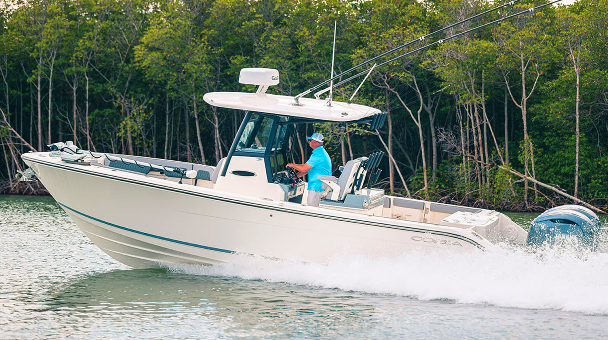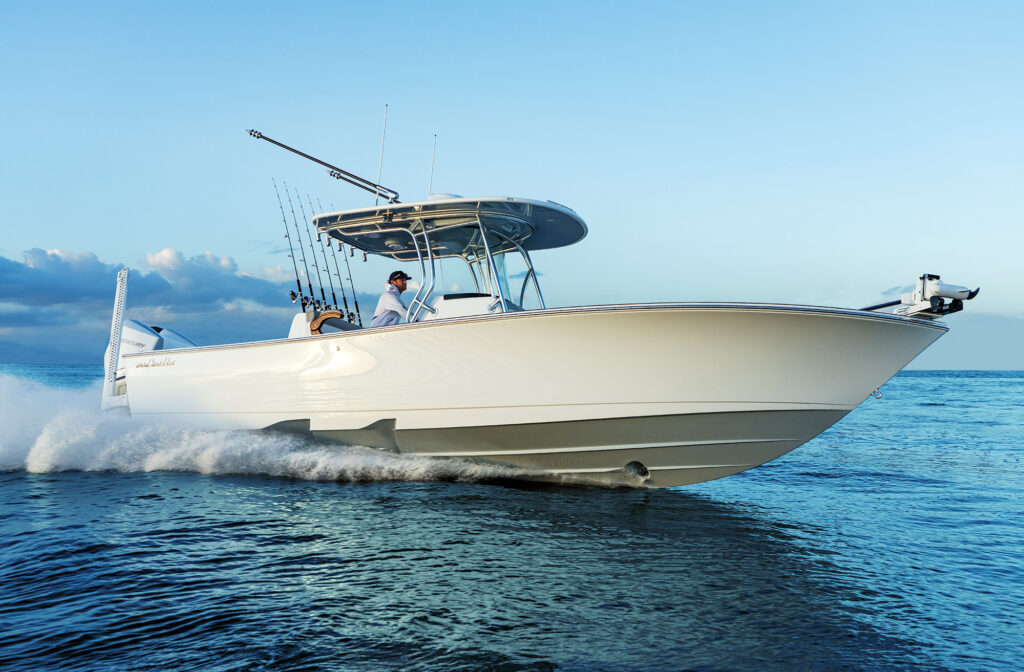 The Cobia 285 Open is an ideal vessel for the family that enjoys fishing in the morning and relaxing at the sandbar in the afternoon. There’s access to the bow, loads of seating and storage galore. The boat is powered with twin 350-hp Yamahas and provides all the fish-finding power you need.