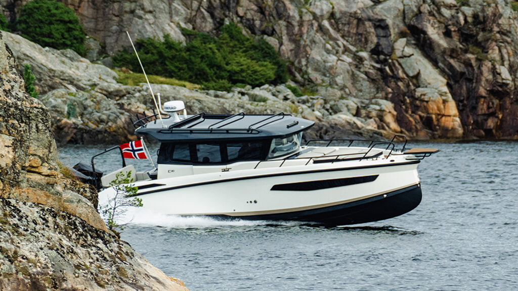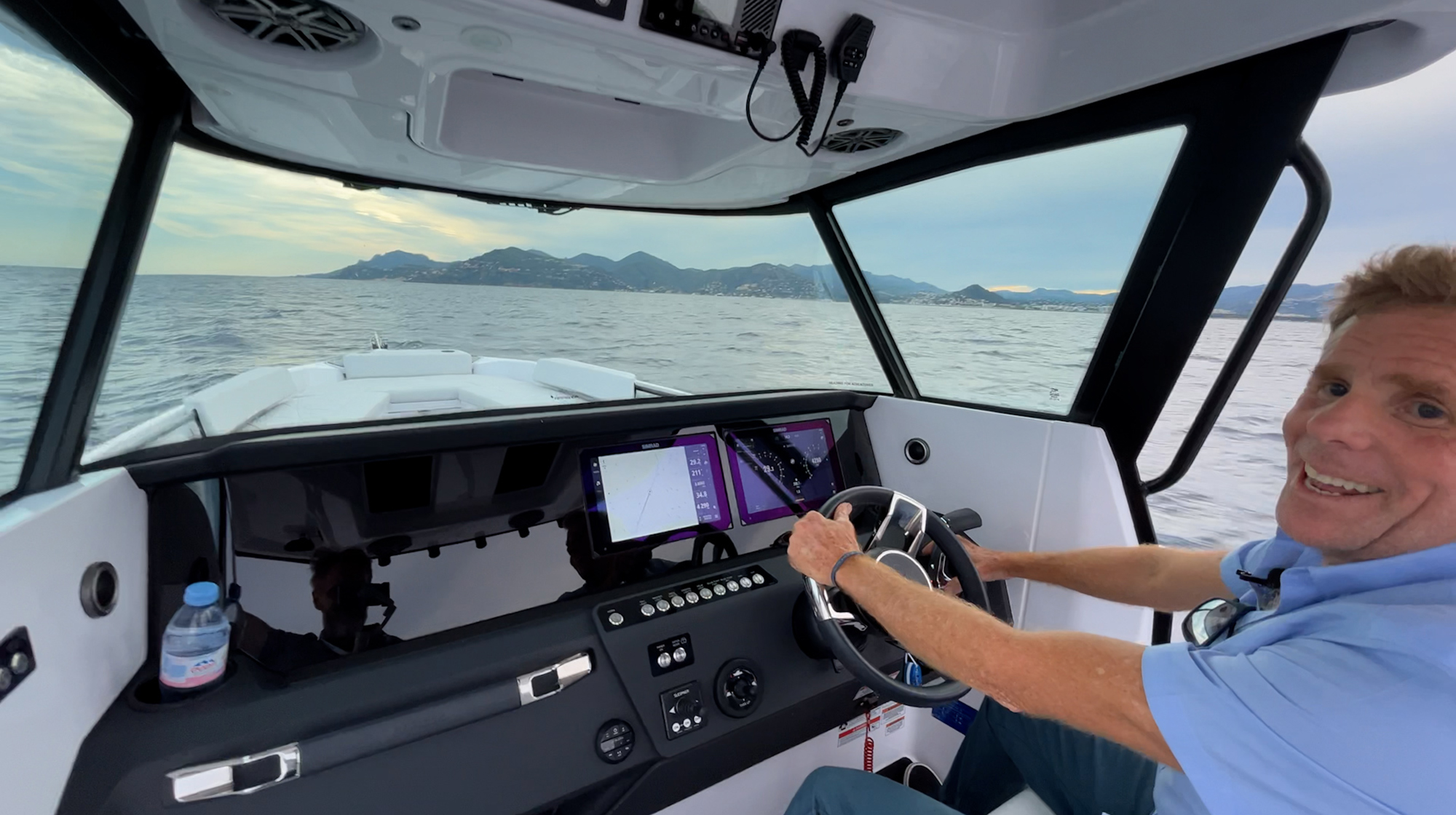 In Cannes, we got a glimpse of the result of Axopar’s investment in Evoy electric with the debut of 22- and 25-foot electric outboard powered boats. At the Ft. Lauderdale boat show, the Swedish adventure boat juggernaut unveiled that 25-footer, the AX/E to the United States market. This versatile, single cabin center console features Evoy’s 300-plus horsepower Storm motor. We say “plus” because it’s capable of bursts to 600 horsepower. Axopar is saying that makes it the fastest production e-boat on the planet. And it has impressive range too.