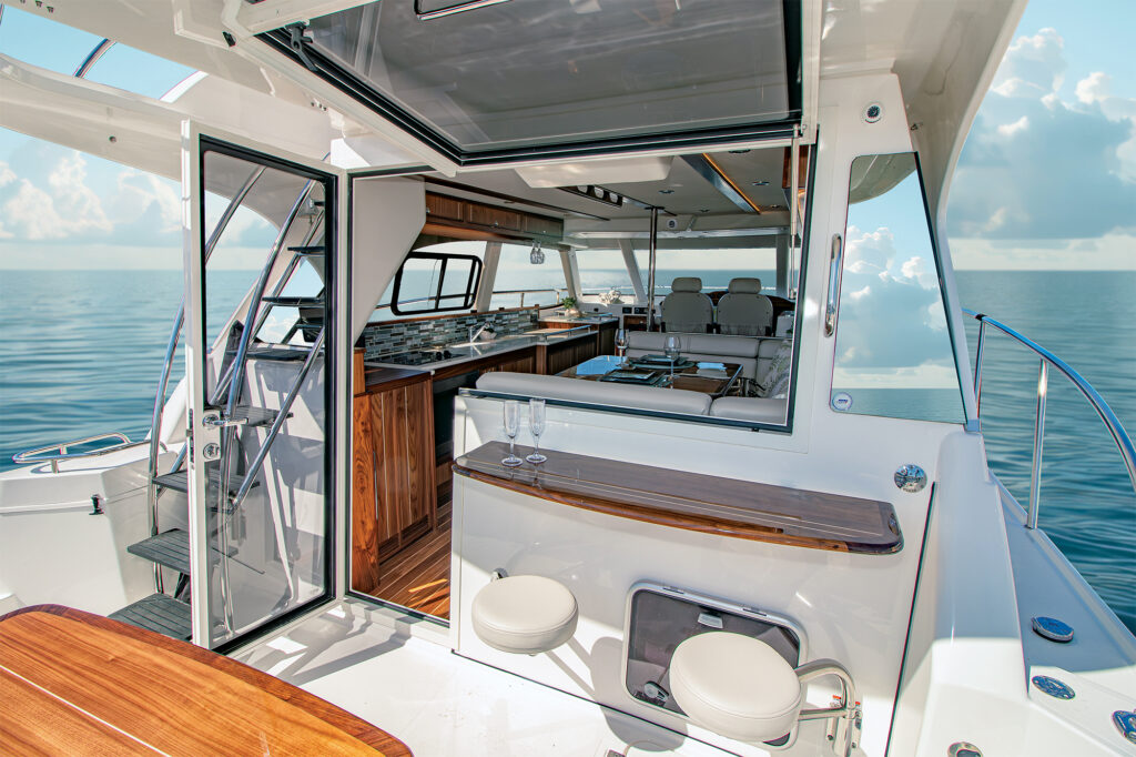 Aft of the cockpit and between both engines, the C128’s davit can safely load a 430-pound 11-foot tender. The owners also opted for a carbon-fiber hardtop atop the flybridge—and the sleek 17-by-11-foot shelter weighs just 240 pounds.