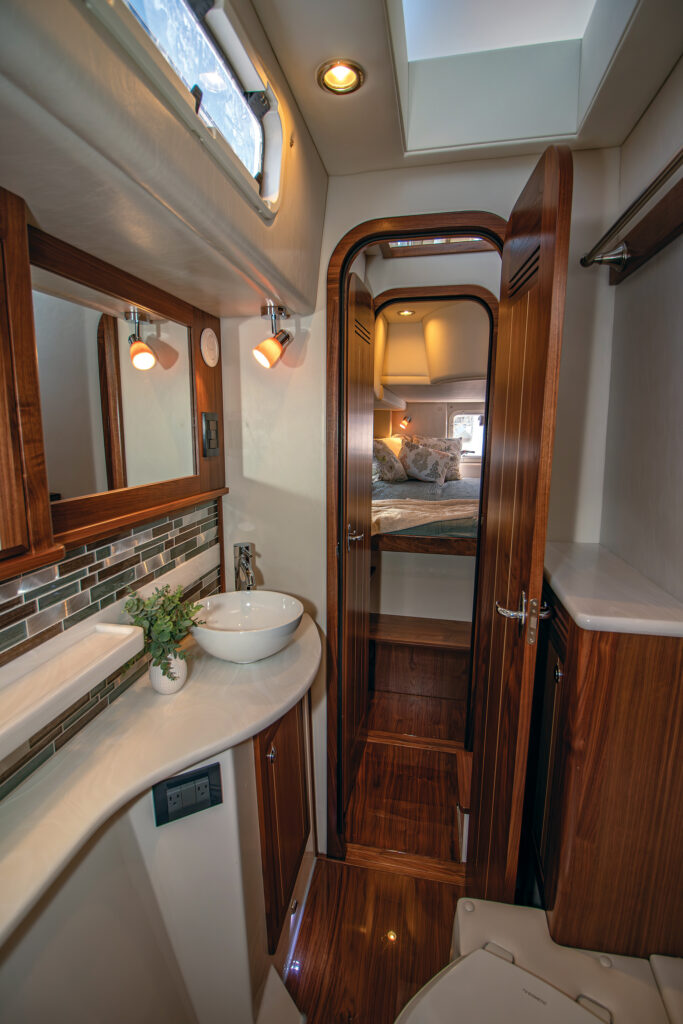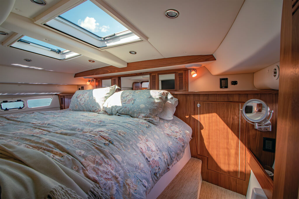 Belowdecks, the forepeak owners’ stateroom can be accessed via port and starboard entrances; this stateroom also offers access to both heads—the starboard one is en suite—with separate showers. Though not en suite, the portside head affords slightly more real estate than its starboard-side counterpart. The master stateroom comes complete with walnut drawers and hanging lockers on either side, an aft-facing king berth, a 19-inch TV, and a pair of skylights.