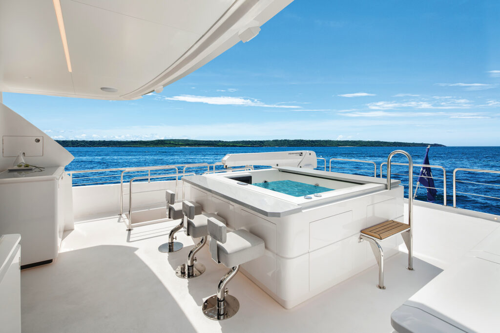 Aft of the helm a wet bar with an icemaker and refrigerator is to port opposite a dining settee for meals when the weather isn’t cooperating. The after portion of the bridge deck is alfresco and features a grill to port and a Jacuzzi on centerline with three barstools and a small bar just forward of it. A davit all the way aft handles tender duties.