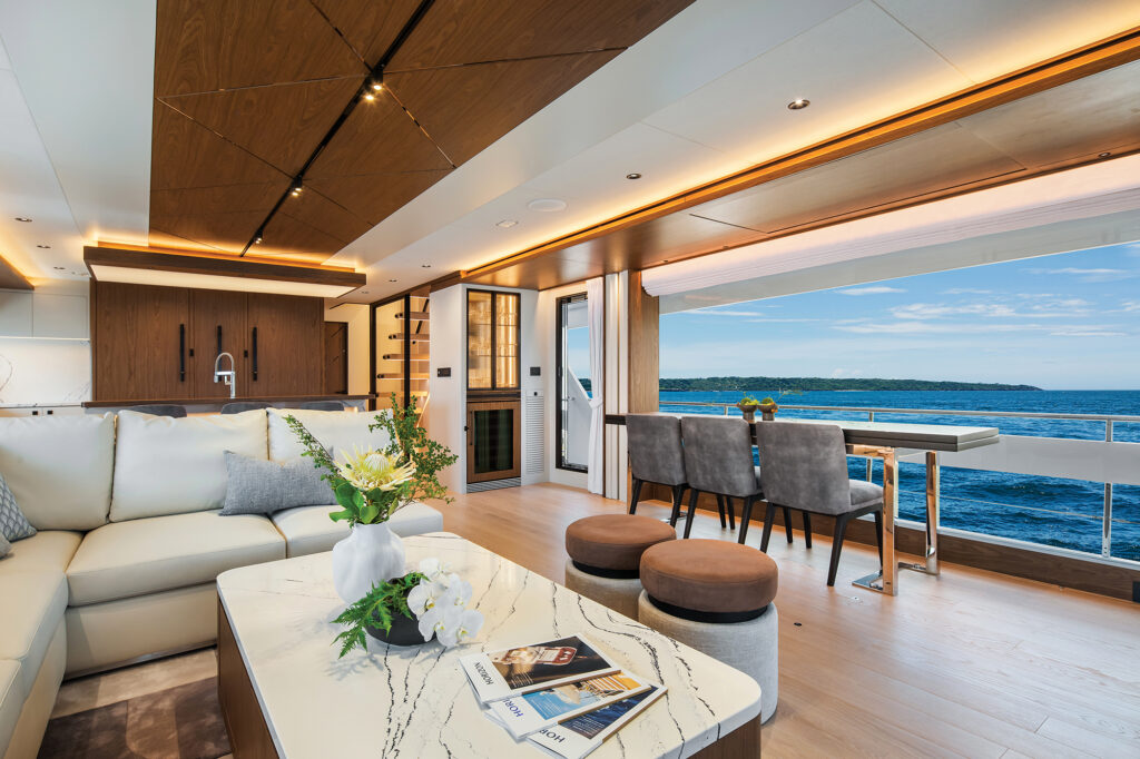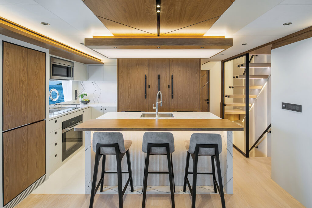 Pleasingly heavy folding doors open over a flush deck providing entrance to the salon where Horizon’s in-house design team created a space typical of this builder’s brand. The salon is warm and inviting, cozy, livable. Polar bear-style seats and sofas dotted the deck, a personal favorite of mine. A large drop-down television to starboard is there if you’re the kind of person who likes to watch TV on a boat. (I judge.) You could easily make yourself at home in this space during the long passages this yacht was designed to undertake. A galley with Miele appliances and a large center countertop forward speaks to an American audience with entertaining at the forefront of their minds. A nearly full-sized wine fridge to starboard also speaks to this yacht’s entertaining prowess.