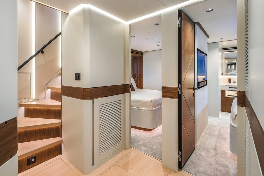 Moving up the boat and onto the bridge deck, one is met with a helm station that would make most any captain smile. A reverse-rake windshield offers excellent sightlines, while at the dash the skipper has access to a bevy of Garmin screens, bow and stern thrusters, Zipwake trim tabs, and a screen that electronically accesses all of the yacht’s systems.