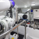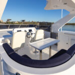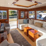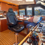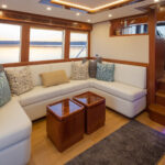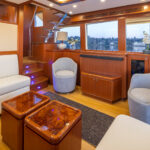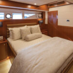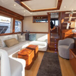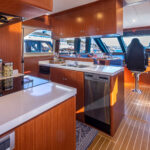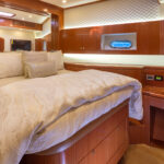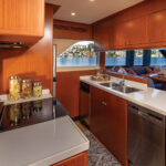 Down in the accomodations area are a full-beam master stateroom, a VIP stateroom forward, a third stateroom with twin bunkbeds and two heads. The galley features condo-sized appliances, which are installed in the States, and an inverter is standard. The dryer (just outside the master stateroom) and microwave vent overboard and don’t recirculate hot air back into the boat, which mitigates the amount of moisture on board. The main salon is spacious with a 42-inch TV on a lift and Bose surround sound.