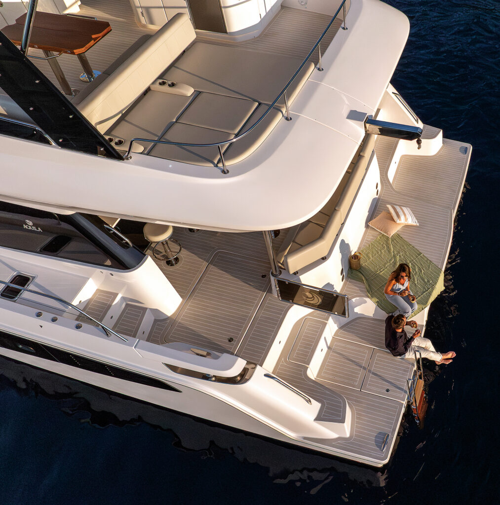 Stepping aboard, you first notice the full-beam beach platform. There’s no hydraulic swim platform, but a sturdy stern ladder/passerelle combination should suffice for most. Just overhead, a nearly hidden crane in the flybridge floor hoists the tender onto that platform.