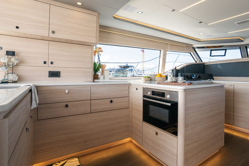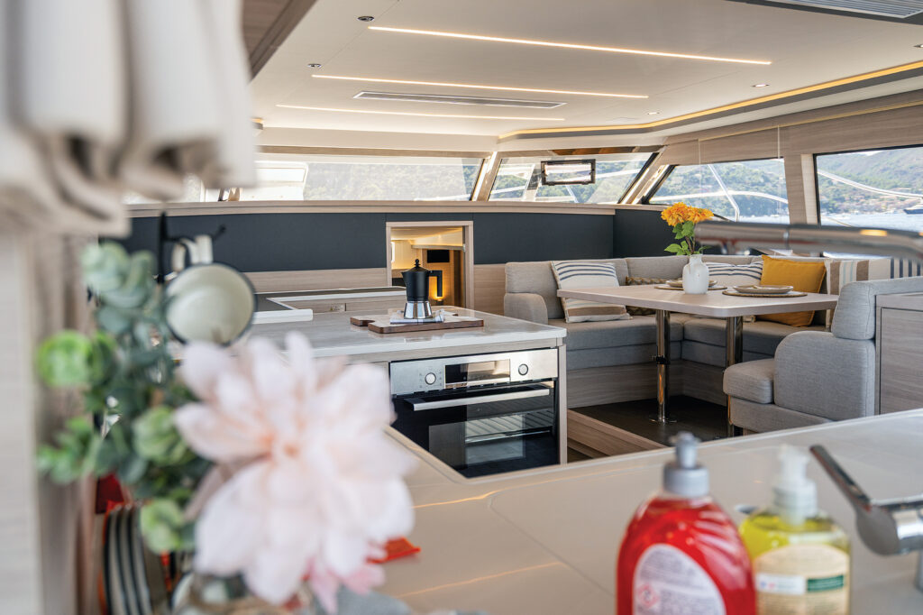Assisting in seakindliness will be the 46’s railings and grab points—which are everywhere—and her 12 feet of freeboard. That’s about four feet higher than on the 44 she replaces in Aquila’s Explorer series, and she joins the newly launched 50 with this added height. This allows more space between the water and the tunnel between the sponsons for less hull slap in rough seas—and a high, flat floor that joins cockpit, salon and master suite. That freeboard also allows huge side windows and an expansive forward cabin—but more on that in a minute.
