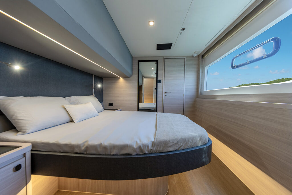 Forward of the salon, a forward passageway leads to the elegant full-beam master. A king size bed anchors the center space. Stepping down to port, you enter a Ritz Carlton level bathroom setup. The head lies all the way forward, dual basin sinks anchor the middle and the shower sits aft. To starboard of the suite, there’s another recessed, but open space. In this case it doubles as a dressing area, powder room, or an office—though you’ll be so distracted gazing seaward, that you might not get anything done. And here’s where we found one of the 46’s unique parlor tricks. Opting for the four-cabin layout, you keep most of this master suite, but this lower starboard area is separated by a bulkhead that creates a fourth cabin. An entry door is added off the salon, and an en suite head—which then conveniently also becomes a day head. Buying this boat to put into charter? Get the four cabin configuration. Then when you’re ready for your own passagemaking, Aquila will sell a module that will re-open the master suite and turn the whole thing back into a single cabin. For full charter service, you can opt for a five cabin configuration. The center master becomes crew quarters with two cabins in each sponson.