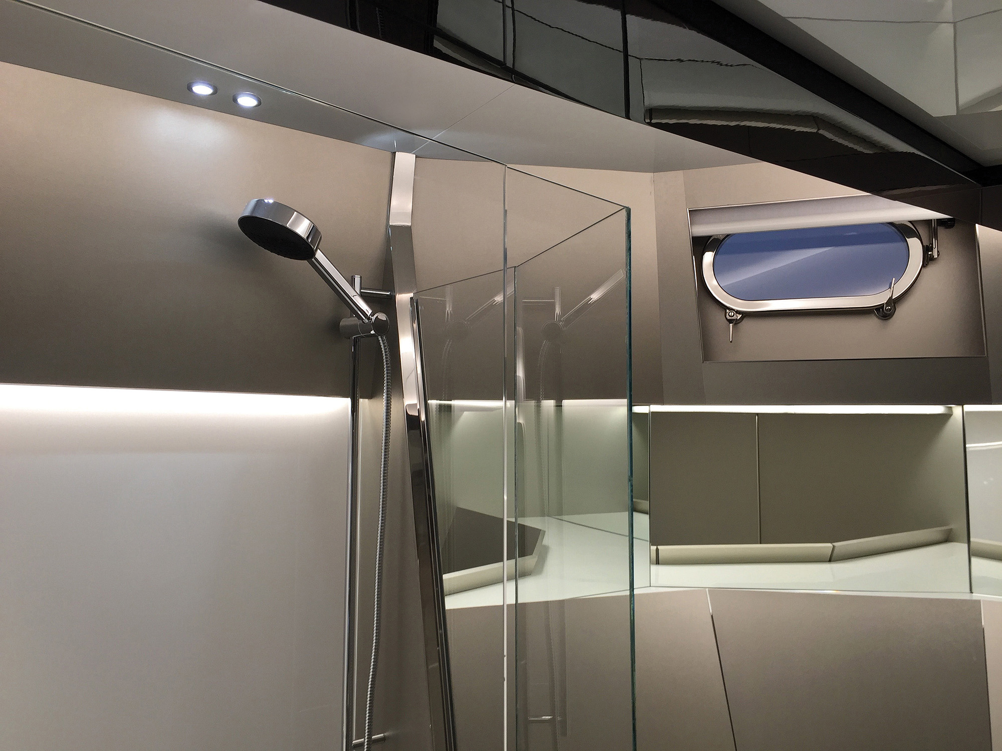 The boat at the 2024 Cannes show sported a variation on the three-cabin option. Normally this would have a twin to port and another to starboard with bunk berths, both sharing a head compartment. Instead of the bunks, however, the show boat’s starboard cabin had twin low-level berths plus a drop-down Pullman.