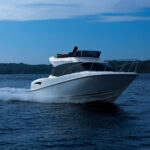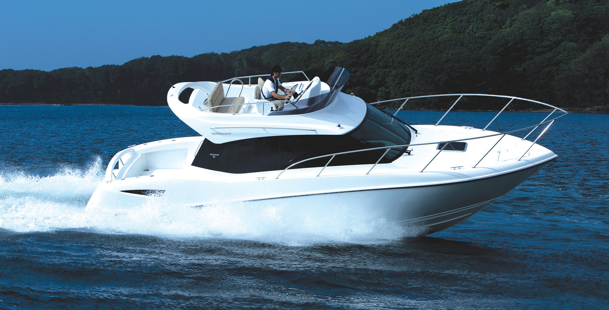 Toyota took an entirely different tack in 2014 with its aluminum-hulled Ponam 31, which it labeled a “Sports Utility Cruiser,” also popularized by the unfortunate acronym “SUC.” Sporting a large flybridge with mezzanine seating, the V-bottom hull is powered by a pair of 3.0-liter turbo diesels from the Land Cruiser Prado which, in the U.S., is the Lexus GX. Marinized with different turbos and cooling, the yacht bears spoiler-styled wings on the bridge and transom. Toyota first launched a Ponam 28 in 1997, naming it after the Maori name for New Zealand’s South Island. The price for the 31 is about $275,000 in Japan.