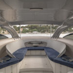 The current 51-foot Cigarette Racing Team Marauder GT-R is a tribute to the Mercedes-AMG GT-R sports car, with ample use of decals and a dark green color called Green Hell—a reference to the dangerous north loop of Germany’s legendary Nurburgring race track. For the AMG version of the standard Cigarette Marauder, the use of carbon fiber has lightened the boat by more than 1,300 pounds and a new deck was created, making room for additional guests. Power comes from a pair of staggered Mercury Racing quad-cam four-valve dry sump engines that can produce up to a total of 3,100 hp for a top speed of 122 knots.