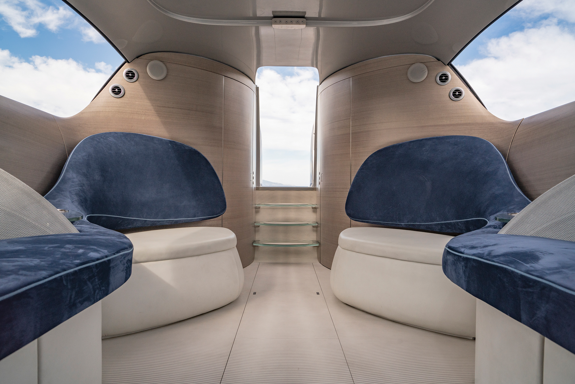 The first GTT 115, appropriately named Jetsetter, is priced at $13.4 million and has a houndstooth fabric décor as a tribute to Porsche 911s of the 1970s. Other car-like touches are a Recaro racing seat for the skipper and lighted racing numbers on interior doors.