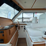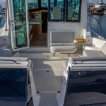 I’d be lying if I said that the cherrywood finish exactly fit my fancy, but what I could not deny was the beautiful nature I could see all around me through the seemingly endless views this boat has to offer. I would venture to say that such visibility is the highlight of this latest model. And with double doors that open to the aft deck and a sliding sunroof and an opening center windshield, this boat is primed to enjoy whatever climate she enters.
