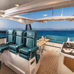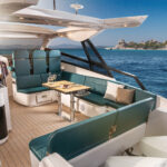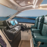 Power comes from twin outboards in options of 150- to 300-hp. Owners can also choose to extend the transom around the motors, giving younger families added peace of mind. The helm accommodates three seats, which, on first glance, look a little rigid, but I’ll save any judgments until after my keister has been parked in one. Behind them, an L-shaped sofa looks incredibly inviting.