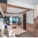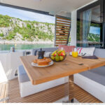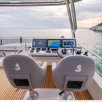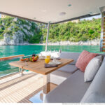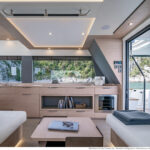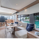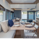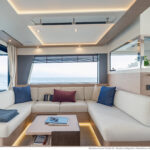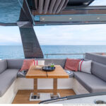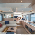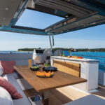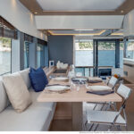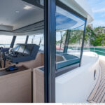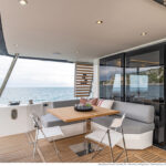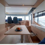 With its substantial side windows, the main deck is a bright and welcoming space, while both galley and helm have their own doors out to the side decks. The dining table, on the starboard side, slides out of the way when not in use, revealing a useful handrail, and it has convenient stowage for its four folding chairs. Another great design feature is the small raised sofa on the port side of the helm station, perfect for the navigator keeping an eye on things when under way.