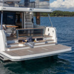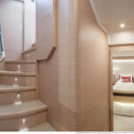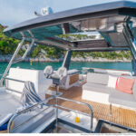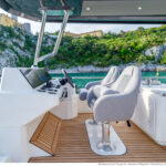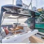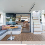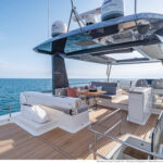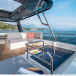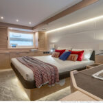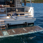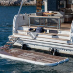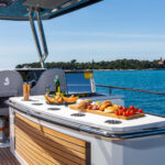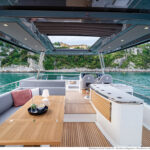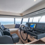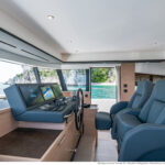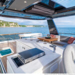 At 333 square feet, the 62’s flybridge is big enough to seat everyone invited on board, and their friends, with room enough aft to accommodate a PWC or a small tender, hoisted up by the 880-pound crane. The main tender sits on the hydraulic swim platform, which has the same lift capability. Plexiglass aft panels on both the flybridge and the cockpit improve the view and make these already spacious deck areas seem even more so. The hinged cushions on the foredeck switch between sunbed and sofa, and plexiglass doors across the side decks shelter the cockpit from the breeze when at anchor.
