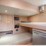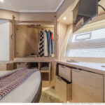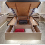 The level of practical detailing on the boat is reassuring. Hinges, catches and handles are robust and well made, and the simple, right-angled layout is space-efficient. The galley’s garbage-disposal system deserves a special mention—the sack beneath the circular lid in the worktop is retrieved from the side deck via an external hatch, so you don’t have to carry trash through the salon.