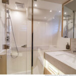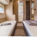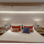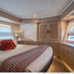 The lower deck accommodation comes with either three or four cabins, and our three-cabin show boat had the generous full-beam master stateroom amidship. In the four-cabin layout this area becomes two twin berths, while the forward stateroom serves as the master. That too is an impressive space, with its double bed offset to one side and its big hull windows, which admit plenty of daylight. The third cabin, to port, is a twin. All the twin berths are supplied with infills for quick conversion into doubles.
