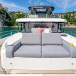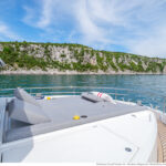 Unlike Düsseldorf, at the Cannes show you can’t crawl around underneath the exhibits unless you’ve brought dive gear, but you can take them out to sea. There was a light chop in the bay, nothing serious, but beam-on to the waves with its stabilizer disengaged, the 62 displayed an insistent roll, which had me looking round to see how many people we had on the flybridge (a lot), and then got me glancing up to gauge the weight of that enormous hardtop. If there were a bimini option I would probably go for it, for its lighter weight. I would definitely opt for the gyro.