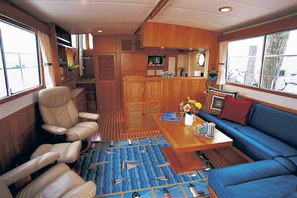 Tracking true and offering a stable ride, the 52 is also showing me some get up and go, as my radar gun reads a top average speed of 26.9 mph at 3300 rpm and a comfortable cruise of 24.4 mph at 3000 rpm. It’s an impressive turn of speed considering her heavy build, which consists of a solid-fiberglass hull bottom, Airex-cored hull sides, and end-grain-balsa-cored decks and house. There’s more, however. When Tegtmeyer tells me the boat is designed to do even better with trim tabs, we give ‘em the ol’ college try. Sure enough, tabs add an extra .9 mph at 2750 rpm, an extra 1.2 mph at 3000 rpm, and an extra .7 mph at 3300 rpm. And, although speed and other changes at the remaining rpm settings prove less significant, we do cut our running attitude by one degree at 3000 rpm.
