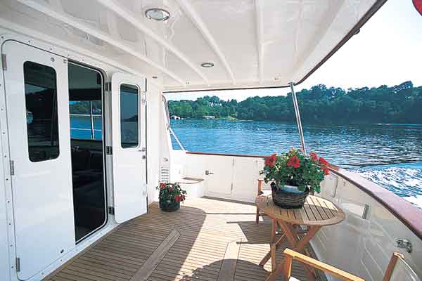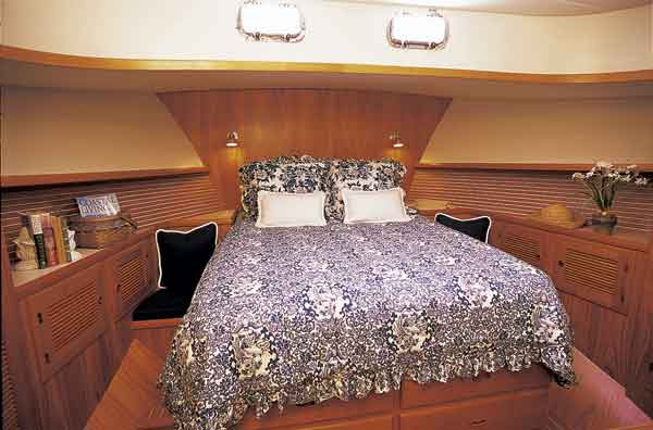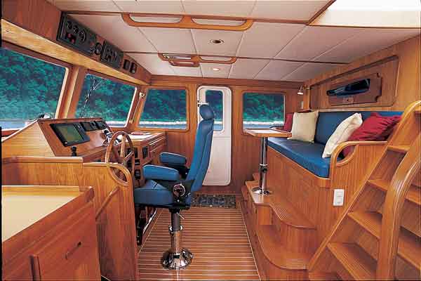 AquaDrive antivibration system; 12-kW Nothern Lights genset; Mathers MicroCommander electronic controls; Bennett trim tabs; Trace 2500 inverter; Glendinning Cablemaster; owner’s choice of hull color; Dutch doors in pilothouse; emergency tiller; transom shower; Avon 320DL tender w/25-hp Yamaha outboard; Nautical Structures davit; Maxwell windlass; 28,000-Btu Cruisair reverse-cycle A/C; GE Profile convection oven; Force 10 cooktop (propane or electric); Corian countertops; cherrywood hi-lo table in saloon; Stidd helm chair; rudder-angle indicator; 2/VacuFlush MSDs; Sharp 22-inch flat-panel TV in saloon; Simrad AP20 autopilot, CA444 plotter, radar, GPS, and echosounder, 4-kW radome, DS44CA repeater on flying bridge; IS-15 depthsounder; Garmin 152 GPS; Icom 502 and 602 VHFs