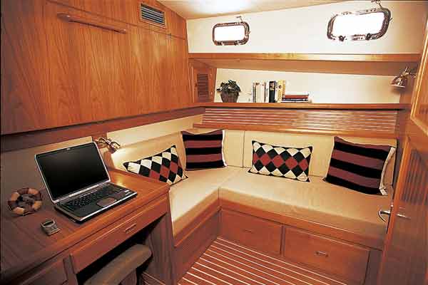 I enter the below-decks areas, and my impression is validated. The master stateroom forward is as bright and airy as the saloon, with a large overhead hatch and 7’4″ headroom, as well as an en suite head, queen-size step-up berth, six under-berth drawers, two full-length cedar-lined closets, eight more drawers for traveling clothes, and even a shoe closet under the vanity. Just aft and to starboard, the office/guest stateroom has some neat features of its own: a desk for those who want an office at sea, a settee that converts to a double, and a Pullman just above the desk. It’s a great place for the kids or a captain. There’s a second head directly across from the guest, and both it and the en suite master head feature VacuFlush MSDs and shower stalls.