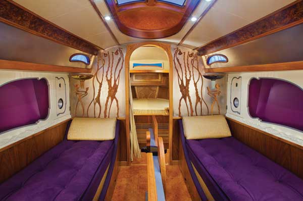 We moved below, to the midcabin, with a functional galley to port, opposite the head. Two long sofa benches flank the folding dining table that collapses to a width of only 4 inches, meaning that even in this relatively narrow boat, you can easily walk around either side of the centerline table, quite a design feat. Sawyer designed the table; actually, he designed, or was instrumental in designing, everything in the boat. Looking forward to Sawyer’s cabin in the bow, copper flowers stand out on hand-carved maple vines on the titanium main bulkhead.