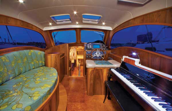 Second, after cruising through some calm and some snotty sea conditions on the Chesapeake, I think this is perhaps the most sea-kindly boat I’ve ever been on. At cruising speed, she offers just a hint of a side-to-side roll, feeling more like a sailboat than a powerboat, and bashing through three-foot head seas she produces a steady ride and a soft landing. With a plumb bow, deep forefoot, sharp angle of entry, hard chine, and canoe stern, Lionheart Concerto is narrow (only an 11-foot 6-inch beam) and Perry says that’s the key to her performance. “Most modern powerboats have very volume-oriented hull forms,” he says, “and this results in a boat that’s prone to slamming and pounding in some choppy conditions. Concerto was designed to be performance oriented in the 12- to 16-knot range, and that priority rules out a volume-oriented shape.” Perry and Sawyer have worked together for 35 years, primarily designing highly efficient cruising sailboats and motorsailers. They tank-tested various versions of Lionheart Concerto in Vancouver until they got it right. “Ken is a lot of fun to work with and has, as you can see, an active imagination and an open mind,” Perry says, somewhat diplomatically. For his part, Sawyer is more direct: “I’d get an idea at three in the morning and call Bob and we’d scream at each other.” After five years of planning, testing, and building, the finished Lionheart Concerto, Sawyer says, “is one person’s view of perfection.”