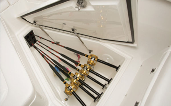 The 25 has a forward seating area with built-in benches and a recessed grabrail, adding family flexibility to the obvious fishing mix. Beneath the cushions are cavernous lockers: port and starboard fishboxes offer dry stowage to the tune of 160 quarts each, while a bow locker holds 140 quarts of volume. Between the benches in the sole we found another locker that holds 408 quarts and has a built-in rod rack.