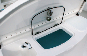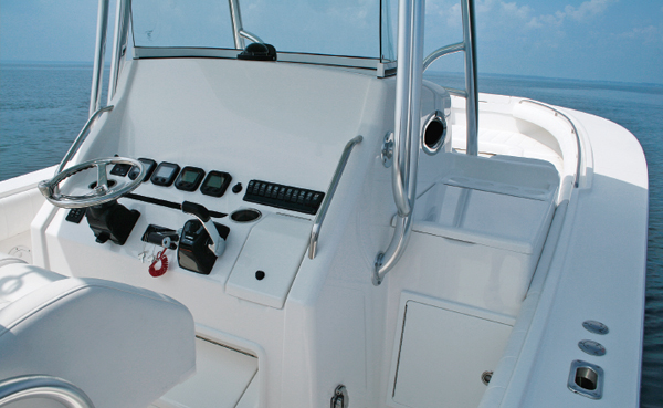 controls; Ritchie Powerdamp compass; Edson wheel w/ PowerKnob; Taylor Made Systems Console Curve tempered-glass windshield; Garelick seating w/ footrest, sink, baitwell, cutting board, and tackle drawer; folding rear seat; VacuFlush MSD w/ 6-gal. holding tank; 40-amp Charles Industries battery charger; 4/schedule 31 marine batteries; 2/Shurflo Pro Blaster pumps (freshwater and saltwater washdown); Shurflo Bait Sentry magnetic drive pump (livewell); Lenco electric trim tabs; 2/insulated and illuminated forward fishboxes; 85-gal. transom fishbox; 4/C.E. Smith s/s rod holders
