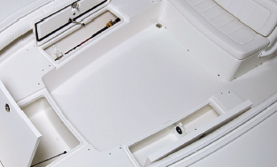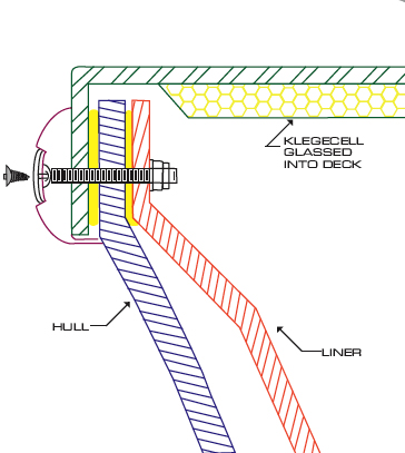 While Regulator goes with the basic shoebox type for the 34, there’s a twist. Instead of securing just the deck and hull together with bolts and urethane adhesive (Regulator uses Bostik 920, shown in yellow in our drawing), the company extends the inner liner up the hull side and adds it to the joint. This is a savvy and (as far as I know) unique measure. It adds solidity to the hull deck construct and reduces liner-related noise and vibration. A smooth unibody ride results, and some fairly low dB-A readings, too.