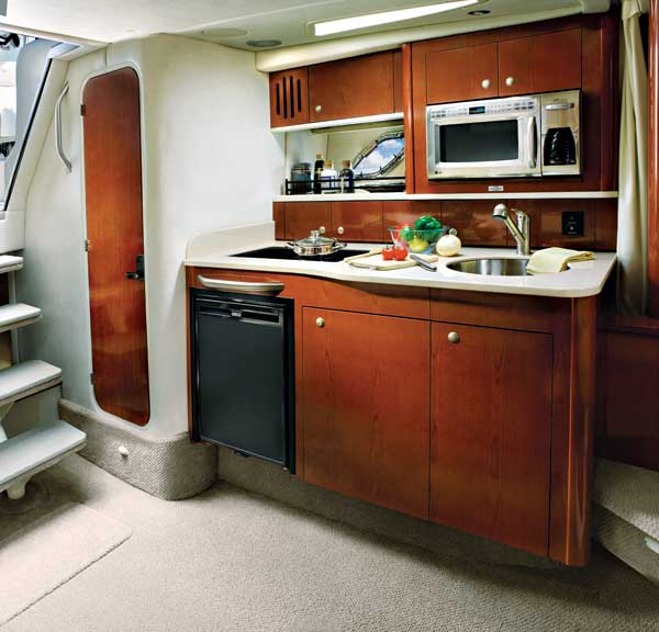 Two things about this televisional multiplication are worth noting. One, there’s a flip-down, spin-around, 17-inch West Coast Custom unit with integral CD player over the V-berth that when lowered blocks an otherwise perfect view of the 26-inch hi-def L&G that resides on the aft bulkhead. Doesn’t that make one of them superfluous? Not if you can imagine yourself drawing the curtain so you don’t have to watch Barney for the 12th time, and not if you consider that the L&G has outputs for video gaming. Of course, so does the 15-inch L&G in the midcabin, which makes this space the perfect choice for kids when Mom and Dad want to reserve the larger, better picture on the 26-incher for themselves. And then, since this is a Sundancer, who wants to be stuck below watching video on a nice day anyway? That explains the 15-inch L&G over the cockpit wet bar.