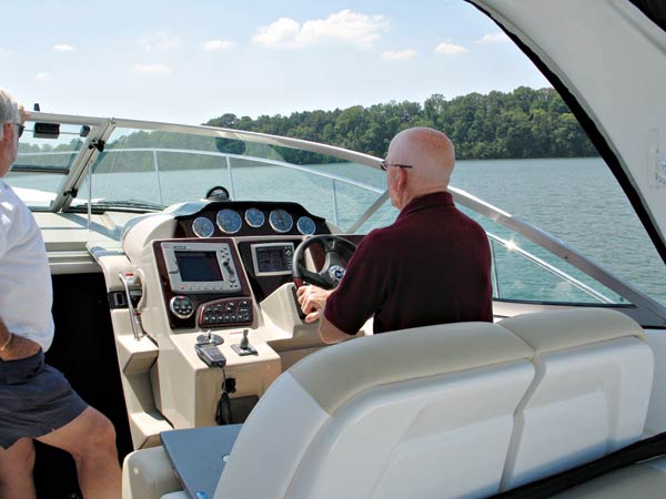Yes, kids of all ages will love the 330, but let’s remember, this is a powerboat—a rather powerful one at that—and as such, attention must be paid to practical matters as well. One of those is helmsman ergonomics. A double helm seat and the raised helm combine to provide excellent sightlines all around, and the redesigned helm panel puts everything of importance right at your fingertips. I especially like the way Sea Ray clusters electrical switches into attractive subpanels, a more aesthetically pleasing and utile alternative to the conventional and definitely not attractive row of rocker switches.
