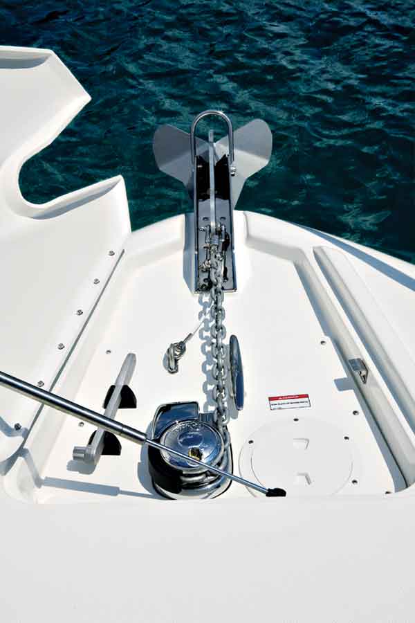 5-kW Kohler genset; Raymarine C80 radar/chartplotter/GPS; anchor washdown system; DSS satellite TV; Digital Throttle & Shift; s/s cockpit barbecue; cockpit icemaker; 5″ remote-controlled spotlight; 17″ West Coast Custom flip-down V-berth TV; 15″ L&G LCD midcabin TV; 15″ L&G LCD cockpit TV w/ DVD player; bow thruster; central vacuum; fold-up foredeck sunpad; additional stereo remote control on transom