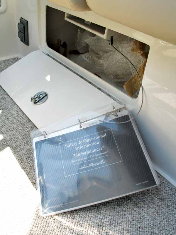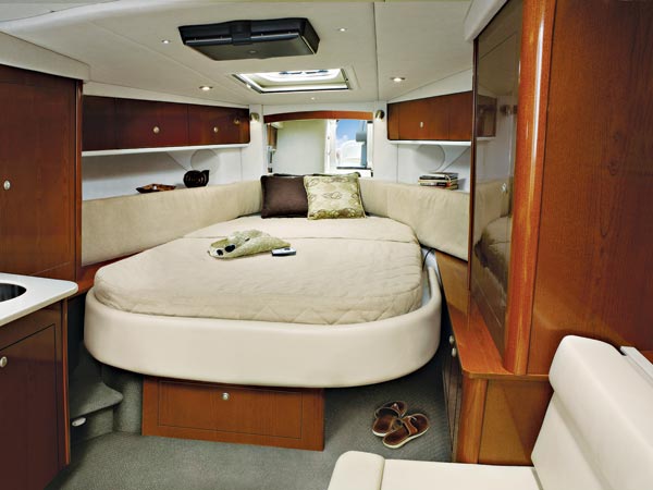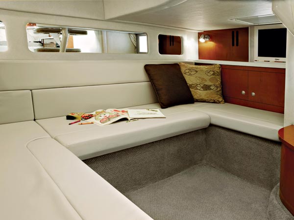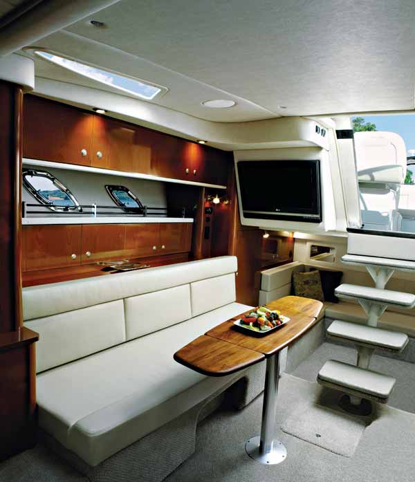 It’s the details, which in the 330 seem to have been inspired by a sharpened sense of how these boats are used—mostly on day or possibly weekend trips with friends and family, especially family and especially kids. So not surprising, this is the most youth-oriented Sundancer I’ve been aboard. For starters, you can order her with four TVs. That’s one TV for about every eight feet, a ratio that if translated to, say, the flagship 60-foot Sundancer, would yield enough video output to rival your local Circuit City.