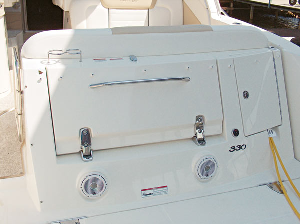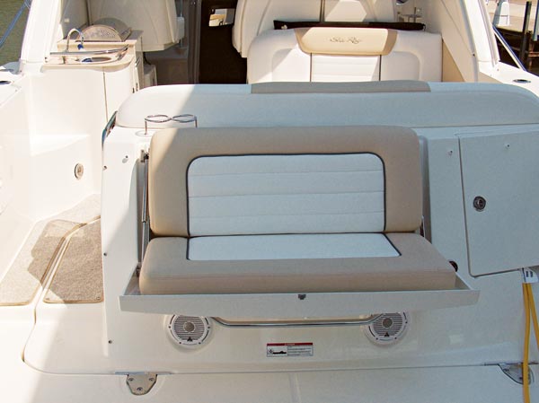 As every parent knows, kids not only require nearly constant visual stimulation, but also hate to be confined—ya’ gotta give ‘em space to roam when you’re at anchor. On the 330 they can do that safely and in spades, thanks to a walk-through windshield that’s easy to access because the sliding saloon door has big, safe steps molded into it. Up there they can chill on the nifty flip-up chaise lounge/sunpad. Or maybe they’ll prefer the flip-down transom seat (first seen on the 310 Sundancer), since back there there’s not only water and a wide swim platform but also tunes in the form of speakers (two of eight) and a remote control for the stereo at their feet. (Sea Ray is working on speakers for the foredeck sunpad.)