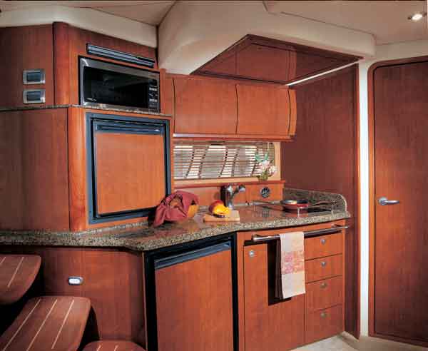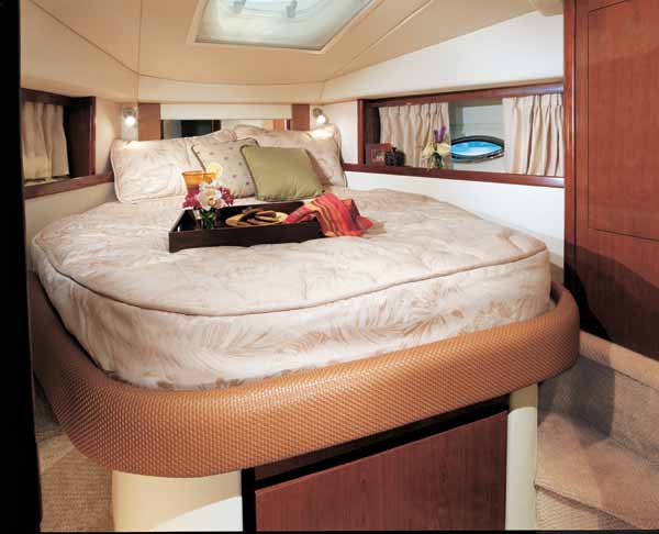 But it was the 38’s cockpit that I found most inviting. Seating abounds, especially aft, where there’s U-shape seating for two to port and an L-shape settee to starboard with room for at least four more, both with stowage below. There’s a wet bar on the port side of the cockpit, with a Corian countertop plus a trash receptacle and cooler beneath it, a detail that eliminates a lot of trips below. Touches like these, plus stainless steel drink holders and four stereo speakers spread around the cockpit (handy, since a six-month subscription to Sirius Satellite Radio also comes standard), make the 38 a top-notch choice for anyone who entertains aboard. If it hadn’t been for the impending hurricane, I could’ve happily spent the rest of the day right there.