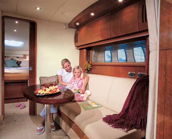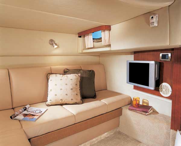 The midcabin, at the after end of the saloon under the bridge deck, offers slightly more than five-foot headroom and has sliding curtains that, when drawn, separate the stateroom from the saloon for privacy, so it’d be fine for kids or adults. It’s not a particularly bright space, a common situation in a midcabin, but there is a small porthole and port lights on both sides of the L-shape Ultraleather settee that converts into a double berth. My test boat featured the optional 15-inch Toshiba flat-screen TV/DVD combo. And in case your guests would prefer an airier space, or you just like to cruise with a crowd, the dinette converts to yet another berth.