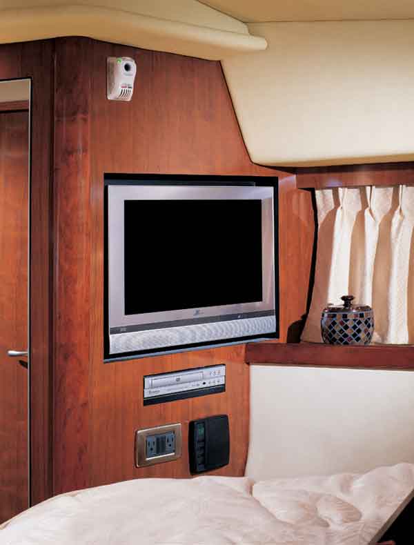 molded fiberglass hardtop w/ aft sunshade; s/s bowrails, grabrails, handrails, cleats, ports, and gauges; swim platform w/ s/s ladder; tempered-glass windshield; Sunbrella canvas; wet bar w/ Corian counters, freezer, and trash receptacle; CO detectors in staterooms; 27″ Zenith LCD TV in saloon; 17″ LCD TV w/ DVD player in master; Sirius satellite receiver w/ 6-month subscription to Sirius Satellite Radio; water mainfold w/ shutoff valve; SmartCraft monitoring system; 7.3-kW Kohler gasoline genset w/ soundshield; 18,000-Btu Cruisair reverse-cycle A/C; trim tabs