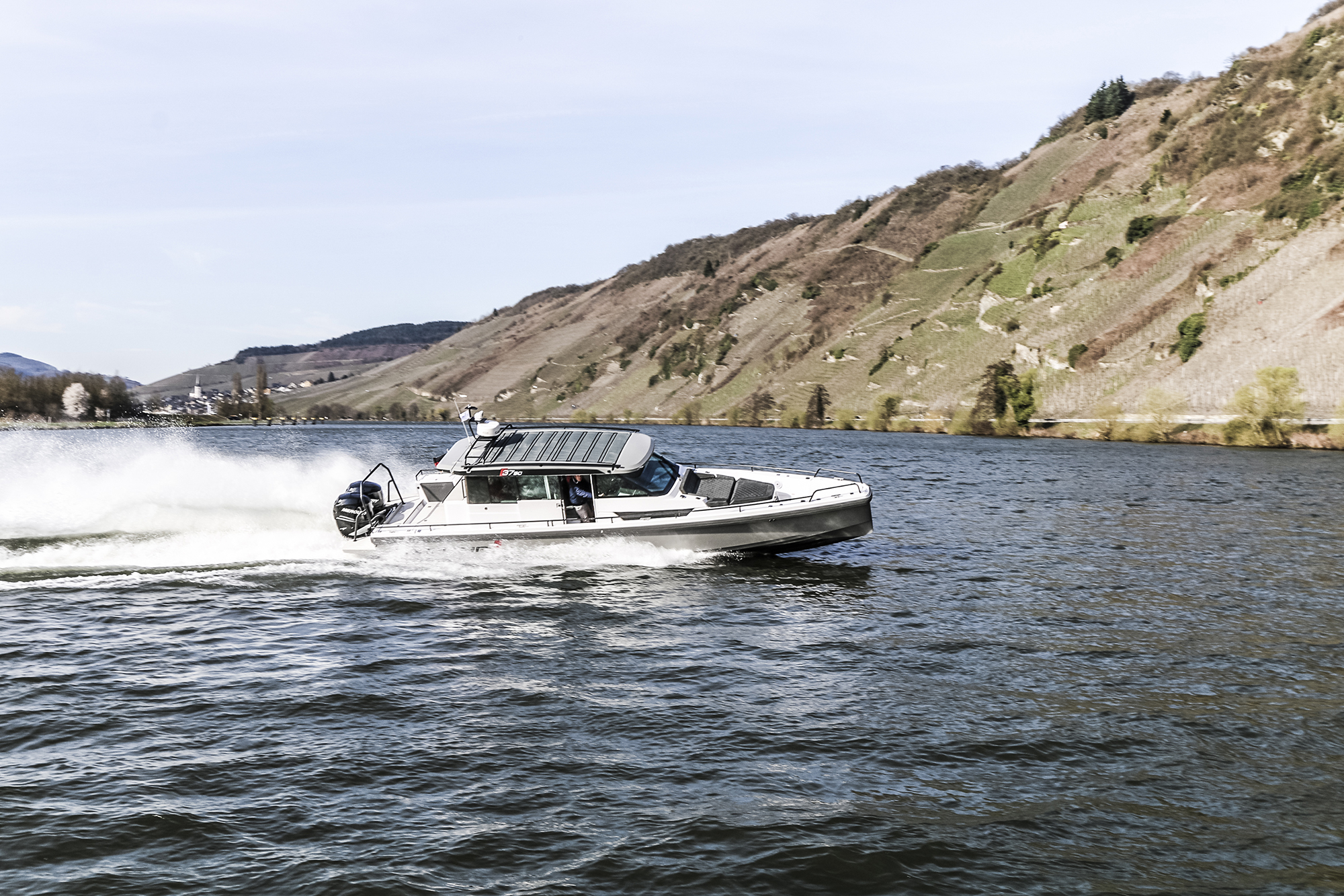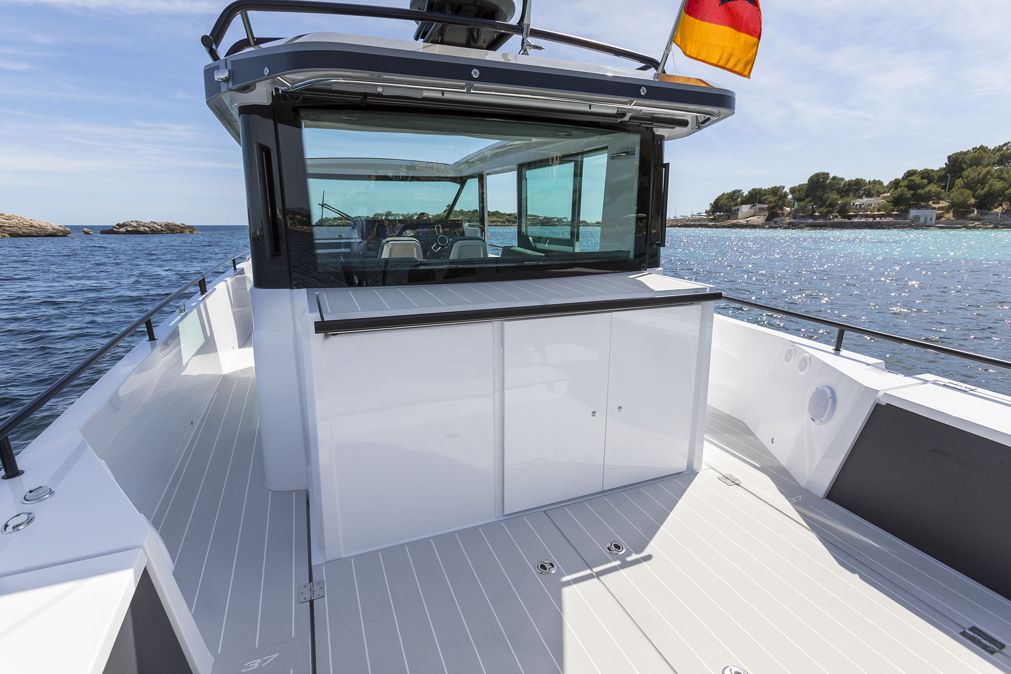 “Now this, this is more like it,” I offered founder Jan-Erik Viitala, as we slipped our lines and made our way to open water. While idling to the harbor, we passed a proverbial Who’s Who of stunning new yachts. I felt a little dirty admiring all the gleaming motoryachts around us while on a sea trial, but looking out, I noticed how many people were noticing the 37 in return. Its gray hull, black hardtop, and low-profile design easily caught the eyes of the passengers on other boats. And as in Düsseldorf, there was a contigent of onlookers snapping photos of the boat.