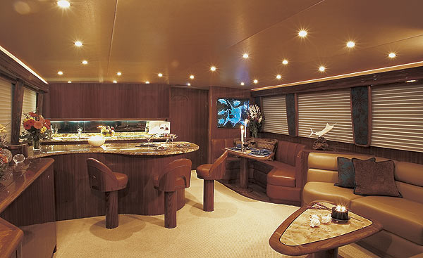 Delta T engine-room ventilation system; Tides Marine dripless shaft seals; 30-gal. water heater; 2/Onan 27.5-kW e-QD gensets; 2/Glendinning Cablemasters; washer/dryer in crew stateroom; Furuno RD-30 depth/sea-temperature gauge, ICOM IC-M602 VHF, top-loading freezer and refrigerated chill box on flying bridge; Headhunter MSDs; Sony 50″ plasma TV w/Bose LifeStyle 35 system in saloon