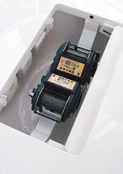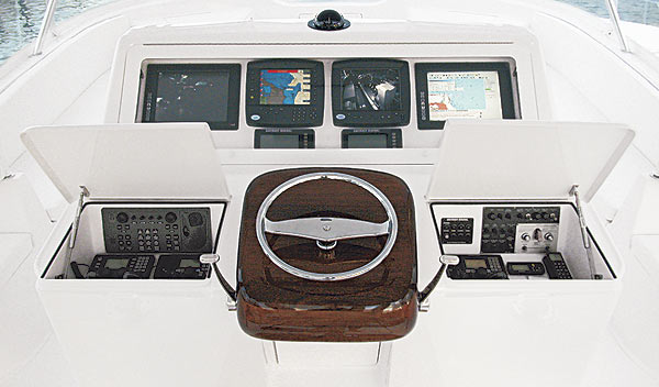 cockpit sole livewell and refrigerated fishbox; Lewmar 30-hp hydraulic bow thruster and RC2500 hydraulic windlass; center ‘rigger; cockpit mister; 2/electric teaser reels in hardtop; Murray Brothers fighting chair w/offset pedestal; Palm Beach tuna tower; main-deck day head; additional 600-gal. fuel tank; 1,200-gpd Sea Recovery watermaker; Atlantic Marine electronics package including Furuno FR-2127 Black Box radar w/42-rpm gearbox, 8″ array, and 15″ VEI LCD screen, FCV-1200 sounder w/RD-30 digital depth and temperature on bridge and tower, FAR 500 autopilot; Northstar 962 plotter w/tower repeater; KVH Tracphone 252 satphone; Icom 802SSB, 2/Icom 602s on bridge and one on tower; KVH 18″ G4 satellite TV system w/4 RCE satellite receivers; Hoteye thermal imaging camera for night running