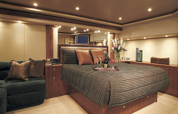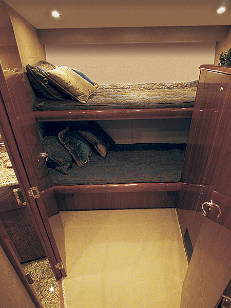 The 74 comes standard with four staterooms, including the crew quarters. (An optional fifth stateroom is located forward and to starboard.) I found the crew stateroom more than adequate, containing bunk berths, a washer/dryer, and plenty of stowage space and headroom. And with that passage through the engine room to the cockpit, the crew can come and go without disturbing the owners and guests. “Also, if we would have put the owner’s suite fully aft instead of locating it amidships and forward of the crew quarters, just think about the crew traipsing around in the galley overhead getting things ready at four or five in the morning,” explained Frederiksen.