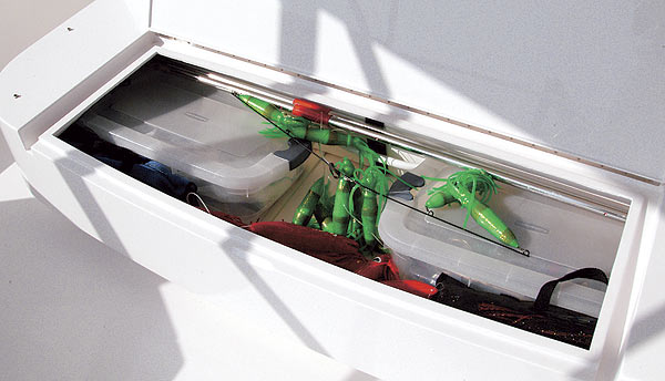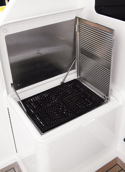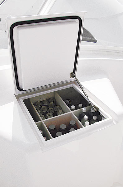 As I stepped aboard, a gentle spray from the optional mister located in the bridge’s overhang filled the area. “That’s the reward for a successful release of a good fish on a hot day,” Healey said with more than a hint of pride as he glanced around the 74’s cockpit. With all that space, I could see plenty of room for multiple anglers and the necessary crew members to get the job done. I liked the hefty two-piece transom door, too. When muscling big fish into the cockpit, there’s always the chance of someone pitching through the space left by the open door; with the lid down, that problem is considerably reduced. Other notable features here include an insole fishbox in the center of the cockpit flanked by a stowage box to either side, one of which can be ordered as a livewell. The aforementioned seating area, with aft-facing lounges located to either side, contains the tackle cabinets, a bait freezer, and stowage, and there’s a refrigerated chill box in the steps to the mezzanine.