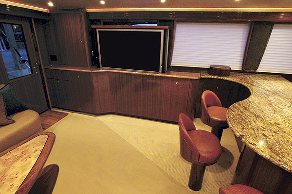 Anglers and cruisers alike will appreciate the main-deck galley, featuring two standard undercounter Sub-Zero refrigerator and freezer units, expansive granite-topped food-prep spaces, and many drawers and cabinets, as well as the saloon’s 50-inch Sony plasma TV, seating areas, and furnishings. But touring those spaces would have to wait, as I heard the diesels come to life. We were about to leave, and better yet, I was going to be at the wheel.